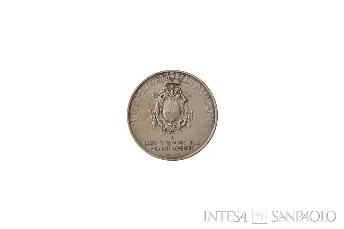 in semicircolo superiore: IL COMUNE DI MILANO. In campo: stemma di Milano, con corona. In basso: A | CASSA DI RISPARMIO DELLE | PROVINCIE LOMBARDE