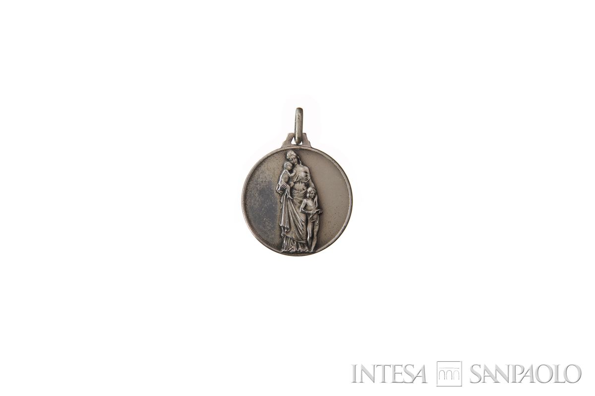 cornice lineare. In campo: figura femminile stante, con due bimbi, uno in braccio e l'altro abbracciato al suo fianco sinistro.