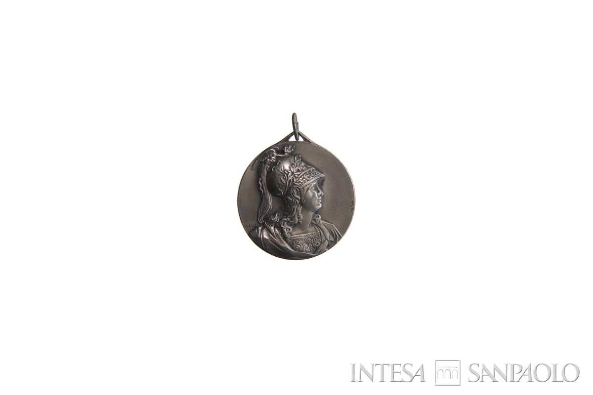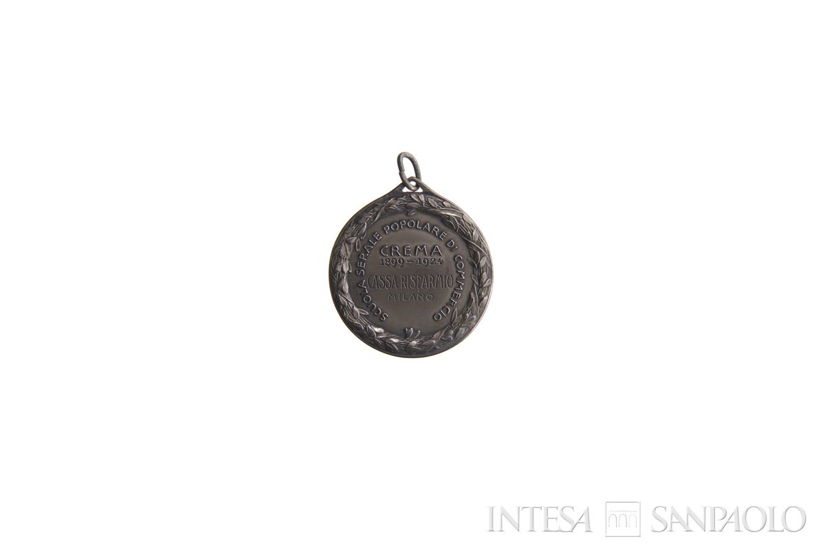 cornice di rami di lauro. Circolarmente: SCUOLA SERALE POPOLARE DI COMMERCIO. In campo: CREMA | 1899-1924 | CASSA RISPARMIO | MILANO
