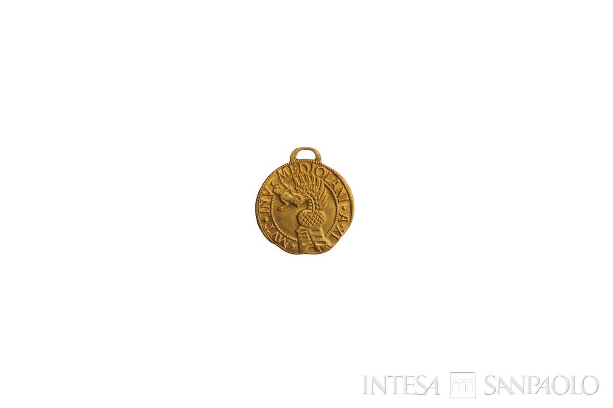 circolarmente, in doppia cornice perlinata: MVT. INV. MEDIOLANI A. XI. In campo: testa di drago, con busto di uomo sporgente dalle fauci.