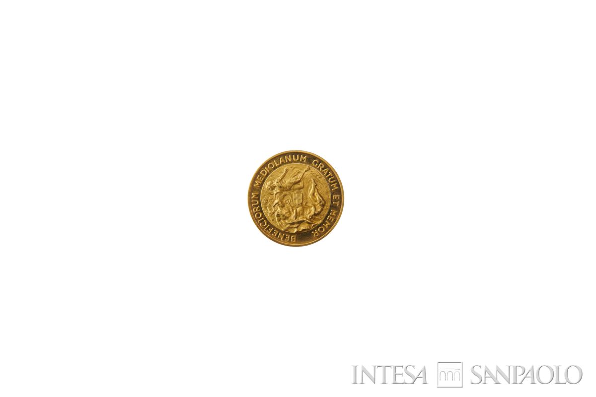 circolarmente: BENEFICIORUM MEDIOLANUM GRATUM ET MEMOR. In campo: tre figure: una maschile con caduceo, due femminili, rispettivamente con cornucopia e stemma di Milano