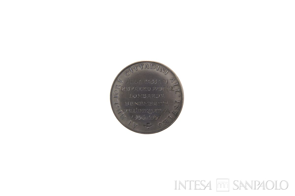 cornice lineare. Circolarmente: AI MIGLIORI CITTADINI ALL'ESTERO. In campo: ALLA CASSA DI | RISPARMIO PROVINCIE | LOMBARDE | BENEMERITE | DELL'INIZIATIVA | 1956-1957.| VENTRELLA - ROMA