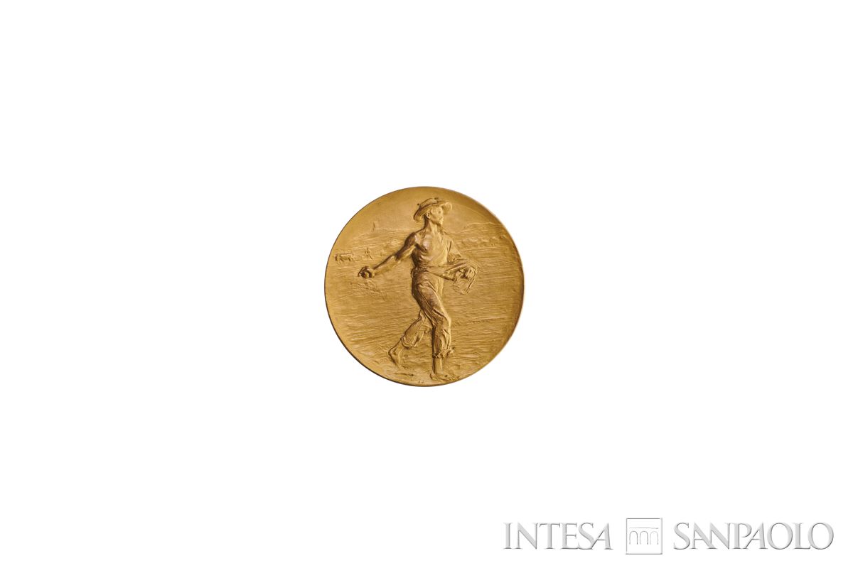 Figura maschile in atto di seminare; sul fondo un campo e aratro trainato da bue