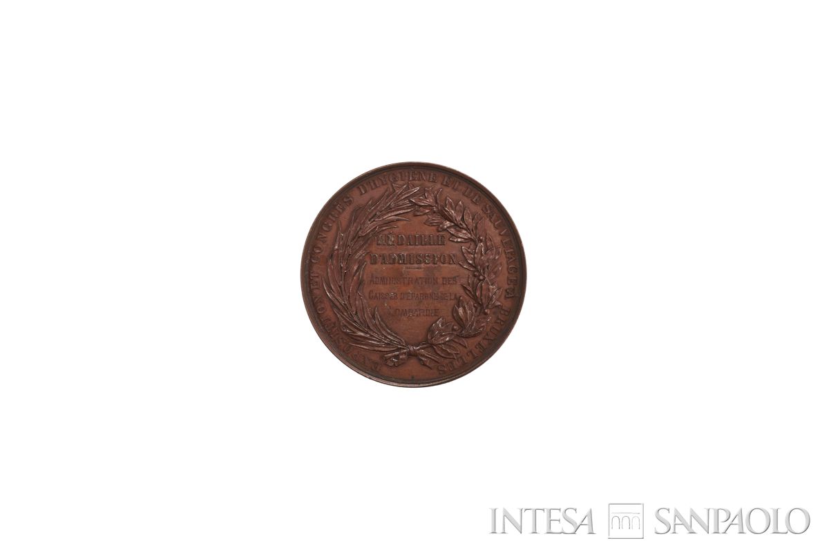 doppia cornice lineare. Circolarmente: EXPOSITION ET CONGRÈS D'HYGIENE ET DE SAUVETAGE A' BRUXELLES. - Corona di lauro. In campo: MÉDAILLE | D'ADMISSION | ADMINISTRATION DES | CAISSES D'EPARGNE DE LA | LOMBARDIE
