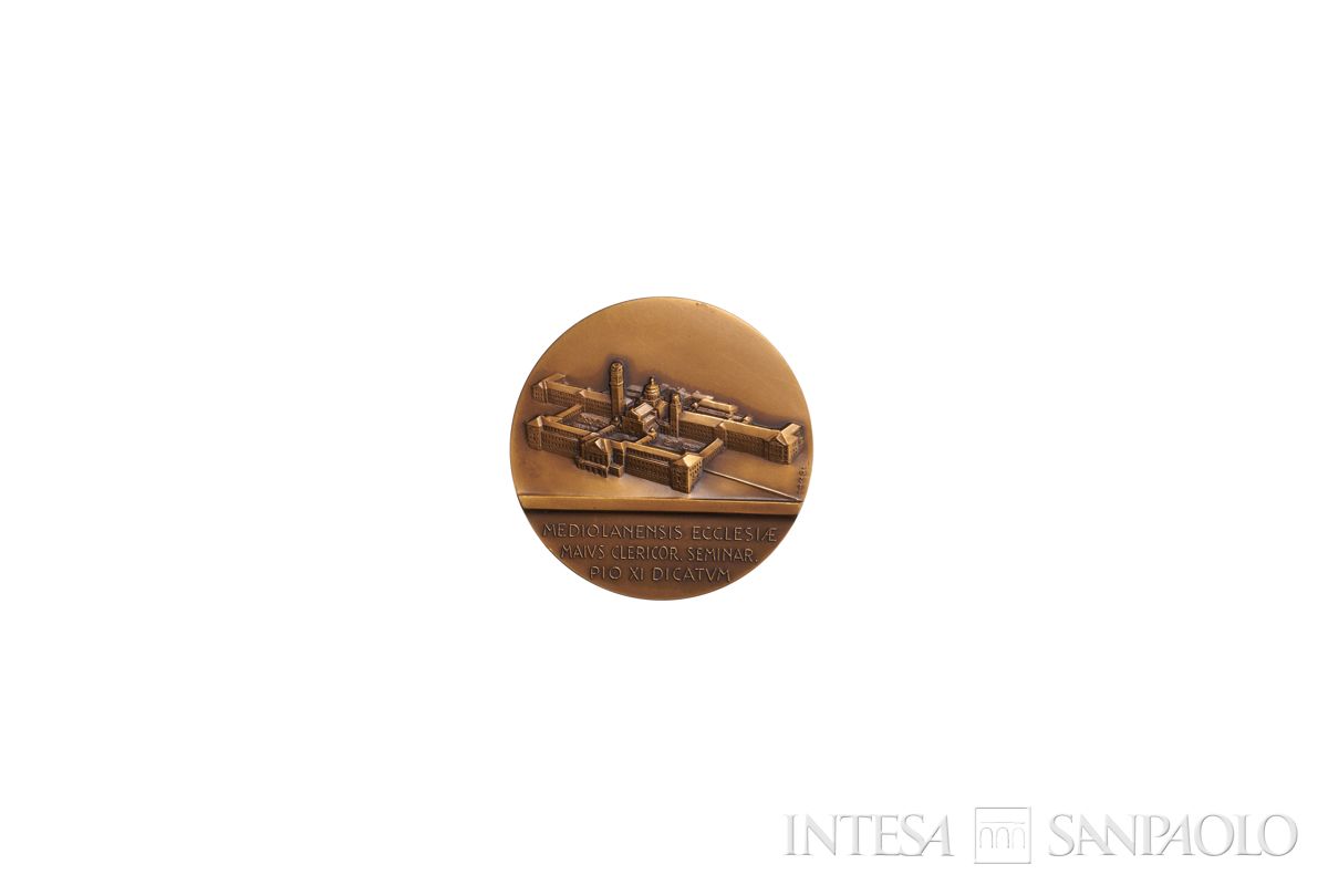 nel semicerchio superiore: vista del Seminario Arcivescovile di Venegono. A destra: LANDI. Al piede, delimitato da linea: MEDIOLANENSIS ECCLESIÆ | MAIVS CLERICOR. SEMINAR. | PIO XI DICATVM