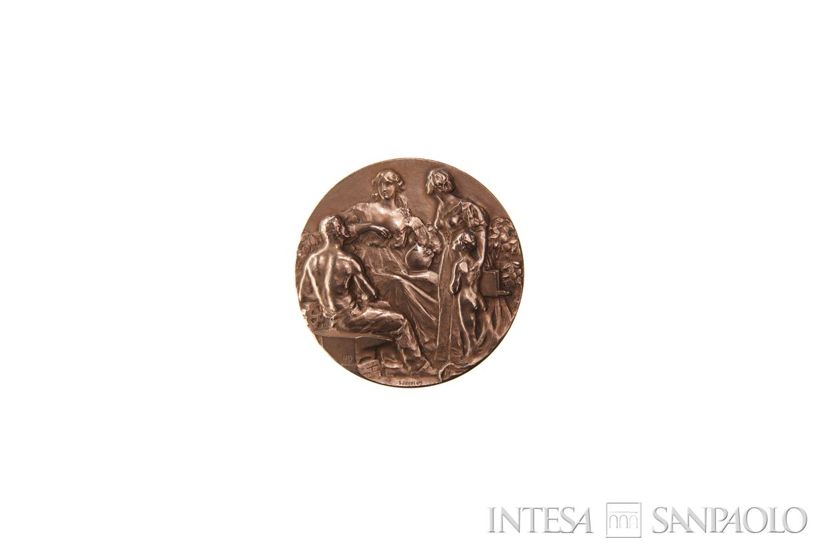 Figura femminile allegorica con salvadanaio (simbolo dell'operosità e del risparmio); al suo cospetto, ai due lati: figura maschile, seduta su incudine (simbolo dell'operosità) con monogramma ADC; madre con figlio