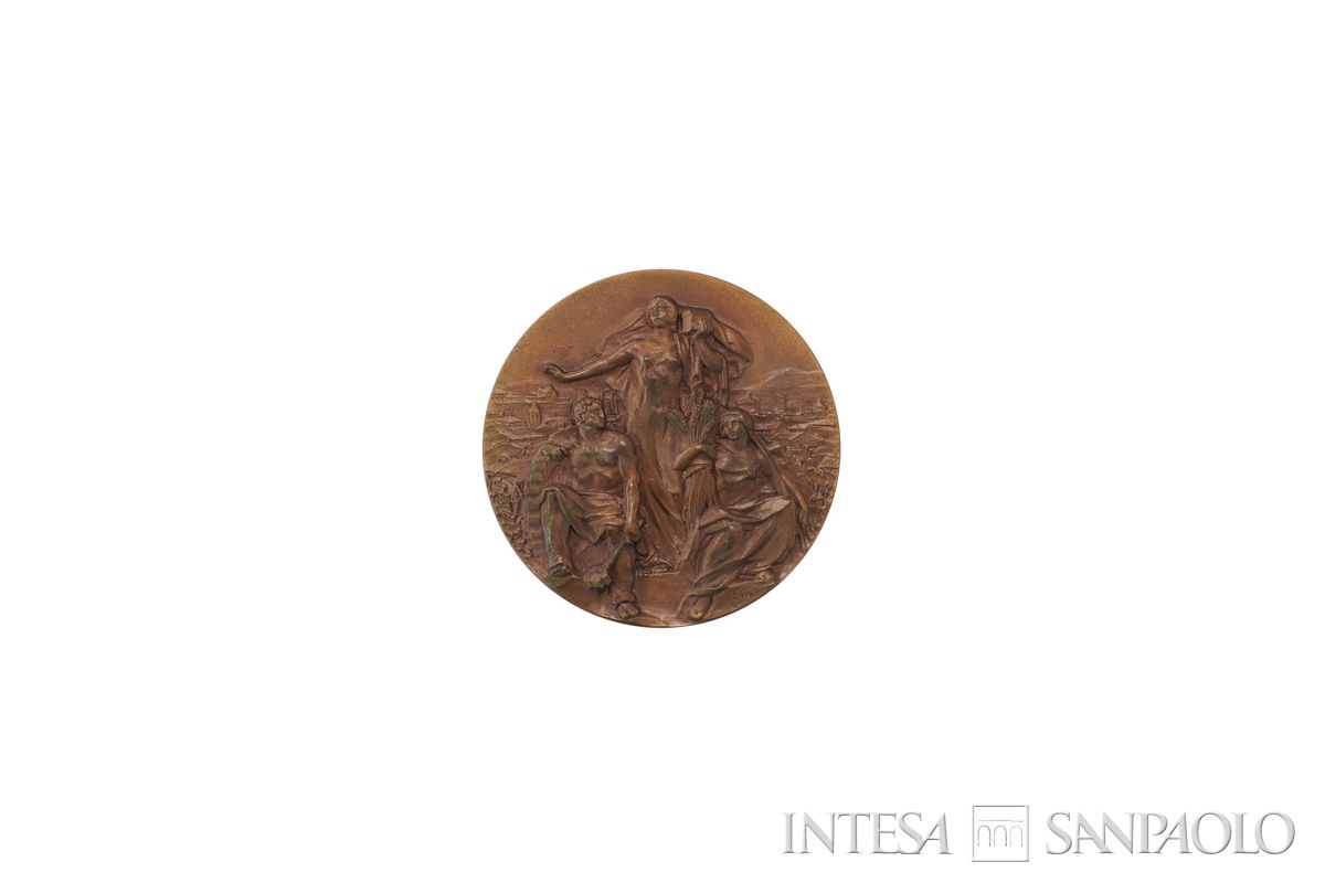 Composizione allegorica di tre figure (personificazioni della Cassa, dell'agricoltura e dell'Industria), con ruota dentata, forziere e spighe. Sul fondo la veduta della città.