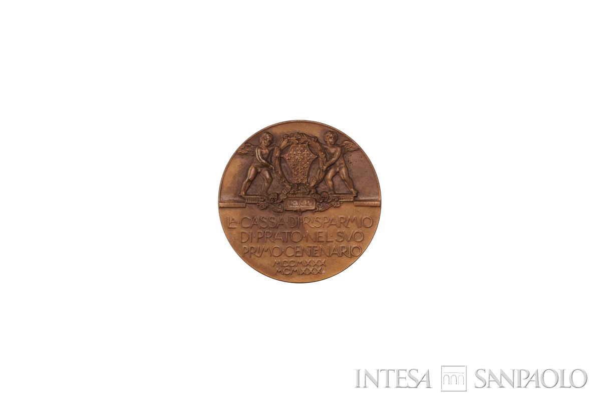 In targa: CRP. Nella lunetta in basso: LA CASSA DI RISPARMIO | DI PRATO NEL SVO | PRIMO CENTENARIO | MCCMXXX | MCMXXX.