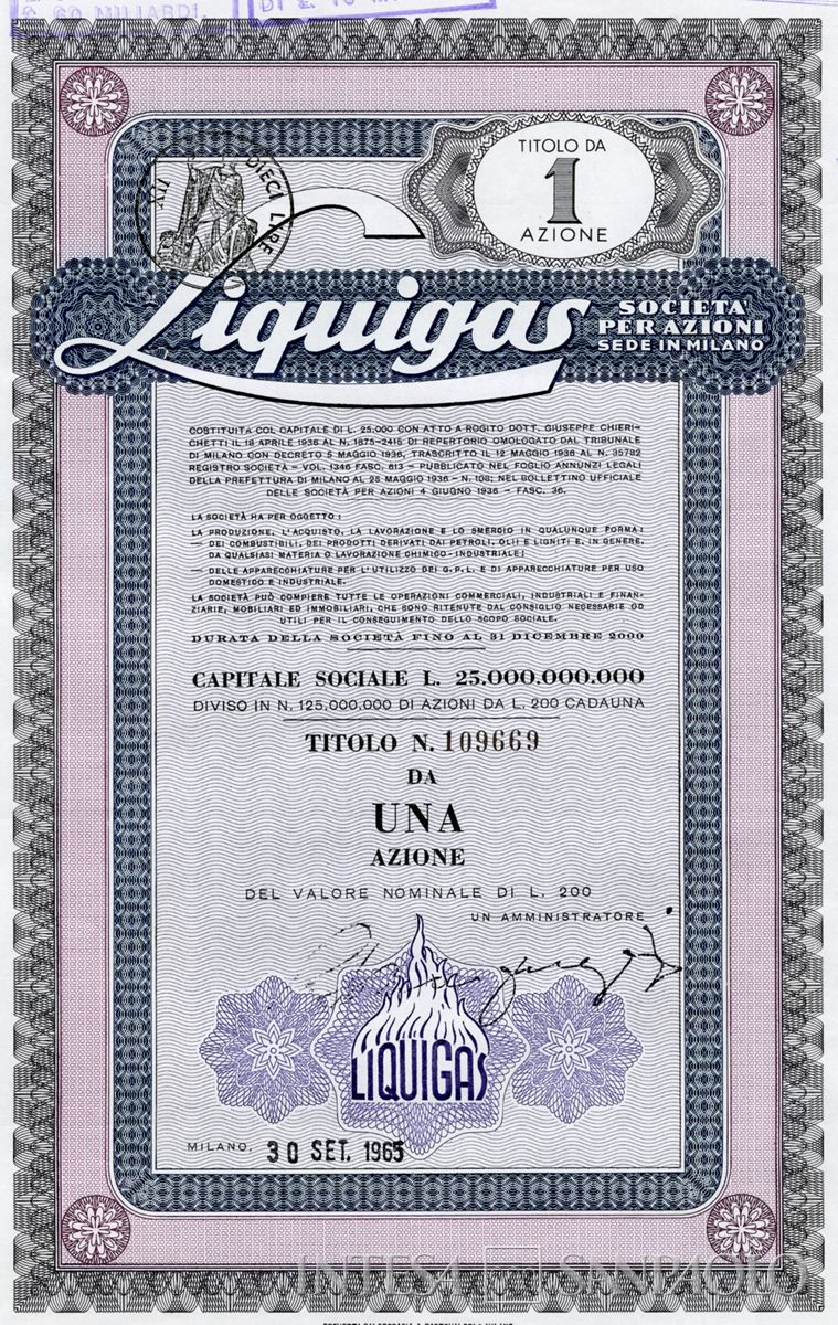 Liquigas SpA, certificati azionari nominativi, 30 settembre 1965