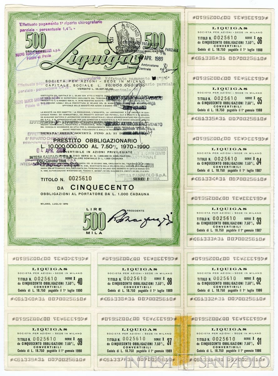 Liquigas SpA, certificati obbligazionari al portatore, luglio 1970