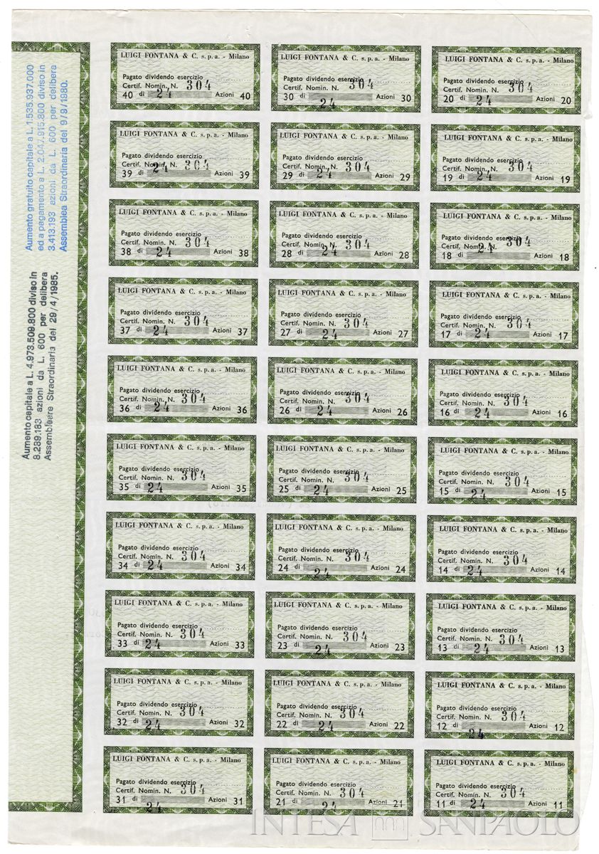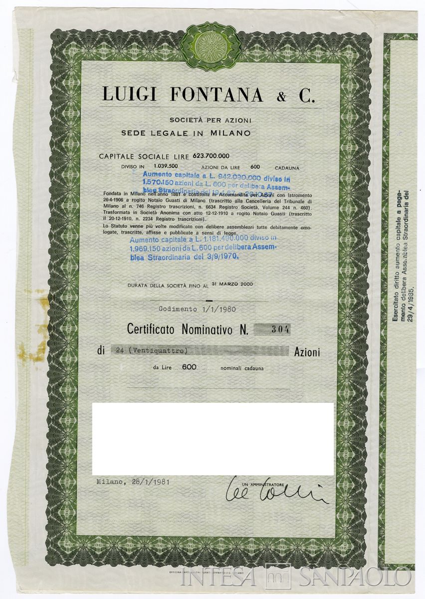 Luigi Fontana & C. SpA, certificato azionario nominativo, 18 gennaio 1981
