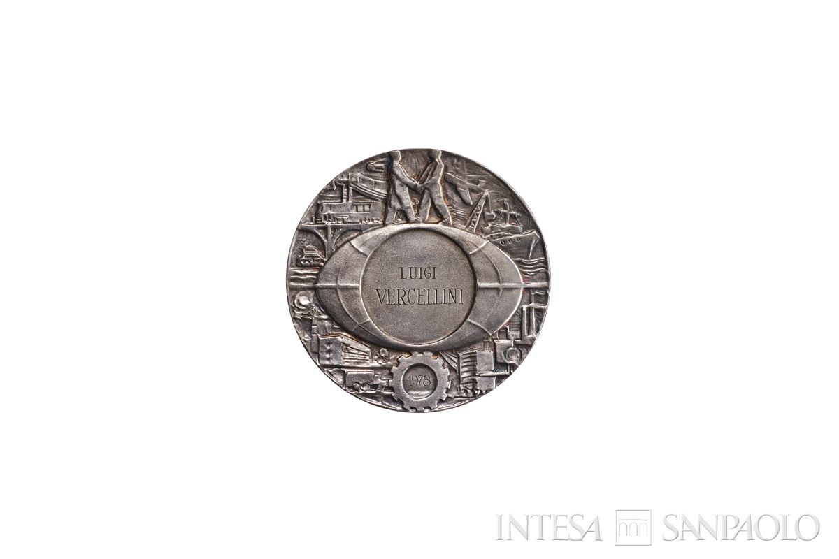 Incisioni di attività industriali, mercantili, navali, edili, trasporti incise circolarmente; in campo un tondo liscio, inscritto in emisfero terrestre, con incisione
