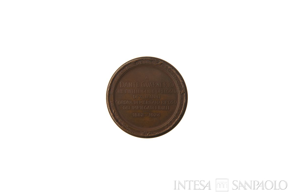 Circolarmente: CASSA DI RISPARMIO DELLE PROVINCIE LOMBARDE; in campo: A | Dante Guarnerio | che l'intelligente operosità | di XLII anni | corona di meritato riposo | gli impiegati filiali | 1882 - 1924
