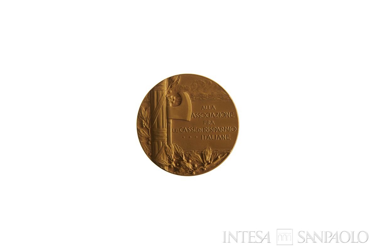 in campo, a sinistra: fascio littorio con rami, foglie e bacche. Sul fondo, a destra: ALLA | ASSOCIAZIONE | FRA | LE CASSE DI RISPARMIO | ITALIANE