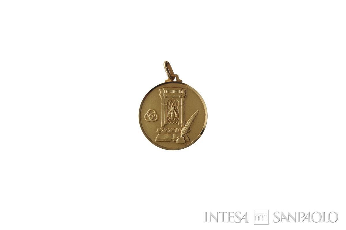 Ape su favo (simbolo dell'Istituto), sotto arco; alla base libro e calamaio con pennino; sulla sinistra 3 cerchi intrecciati