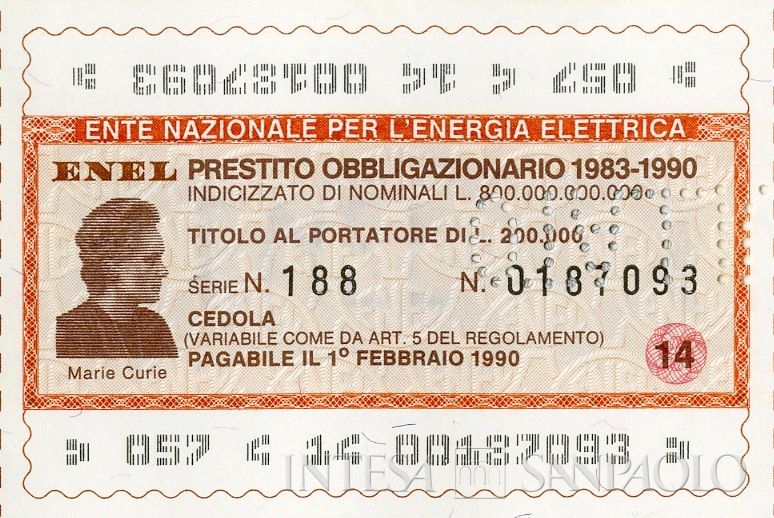 con cedole parziali; cornice decorativa; al margine superiore ritratto in ovale di Marie Curie; al margine inferiore timbro a secco dell'Ente
