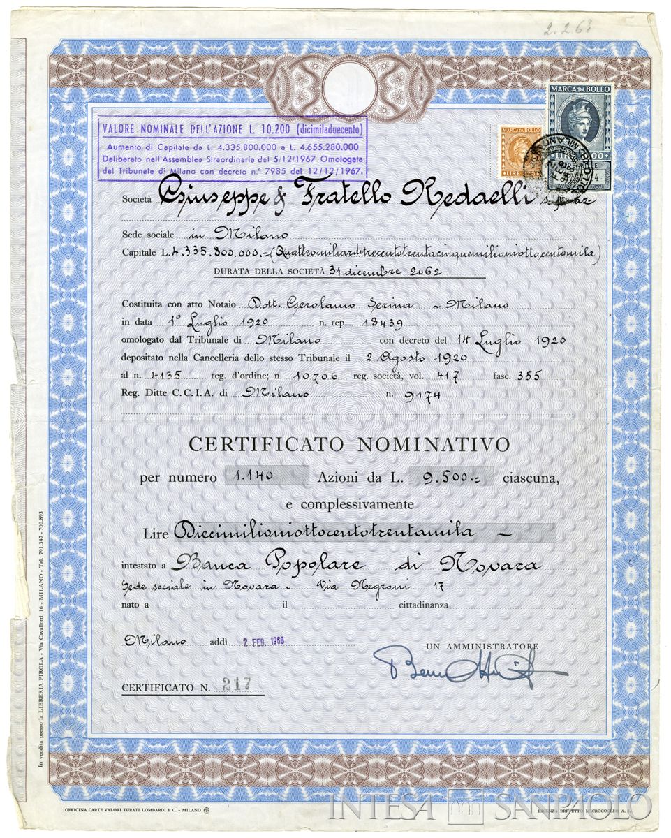 Giuseppe & Fratello Redaelli SpA, certificato azionario nominativo, 02 febbraio 1968
