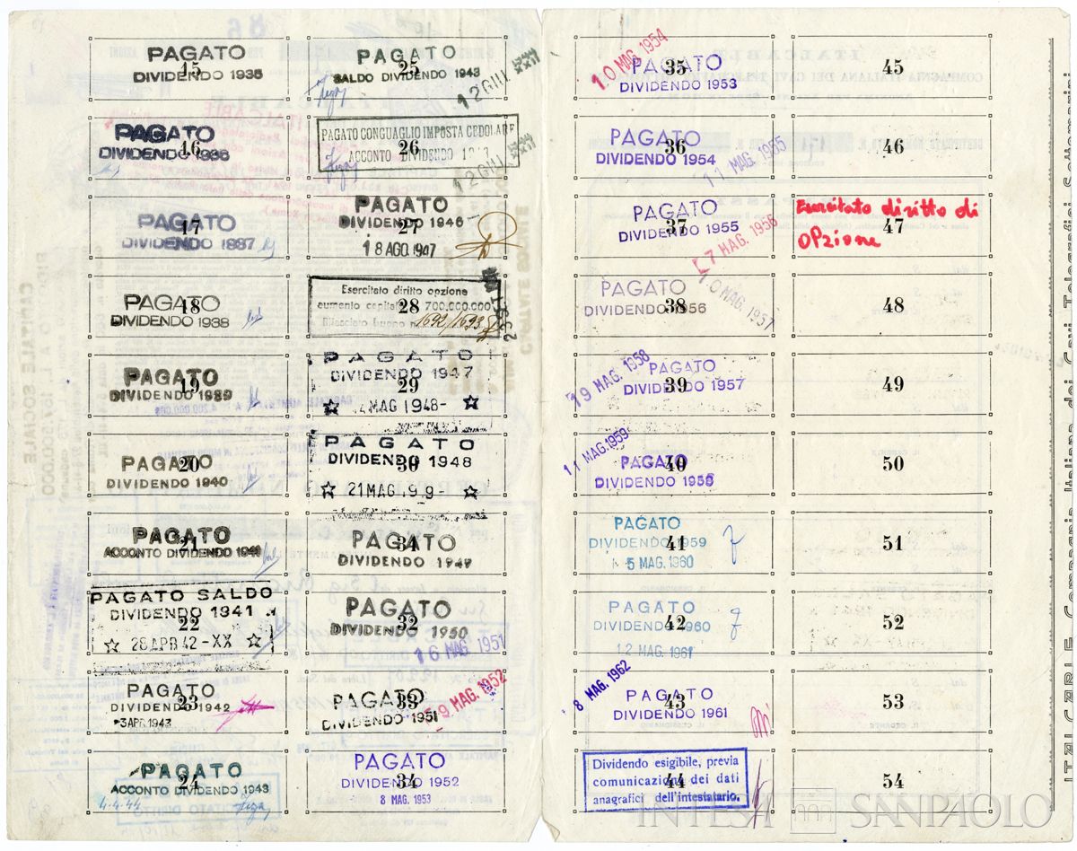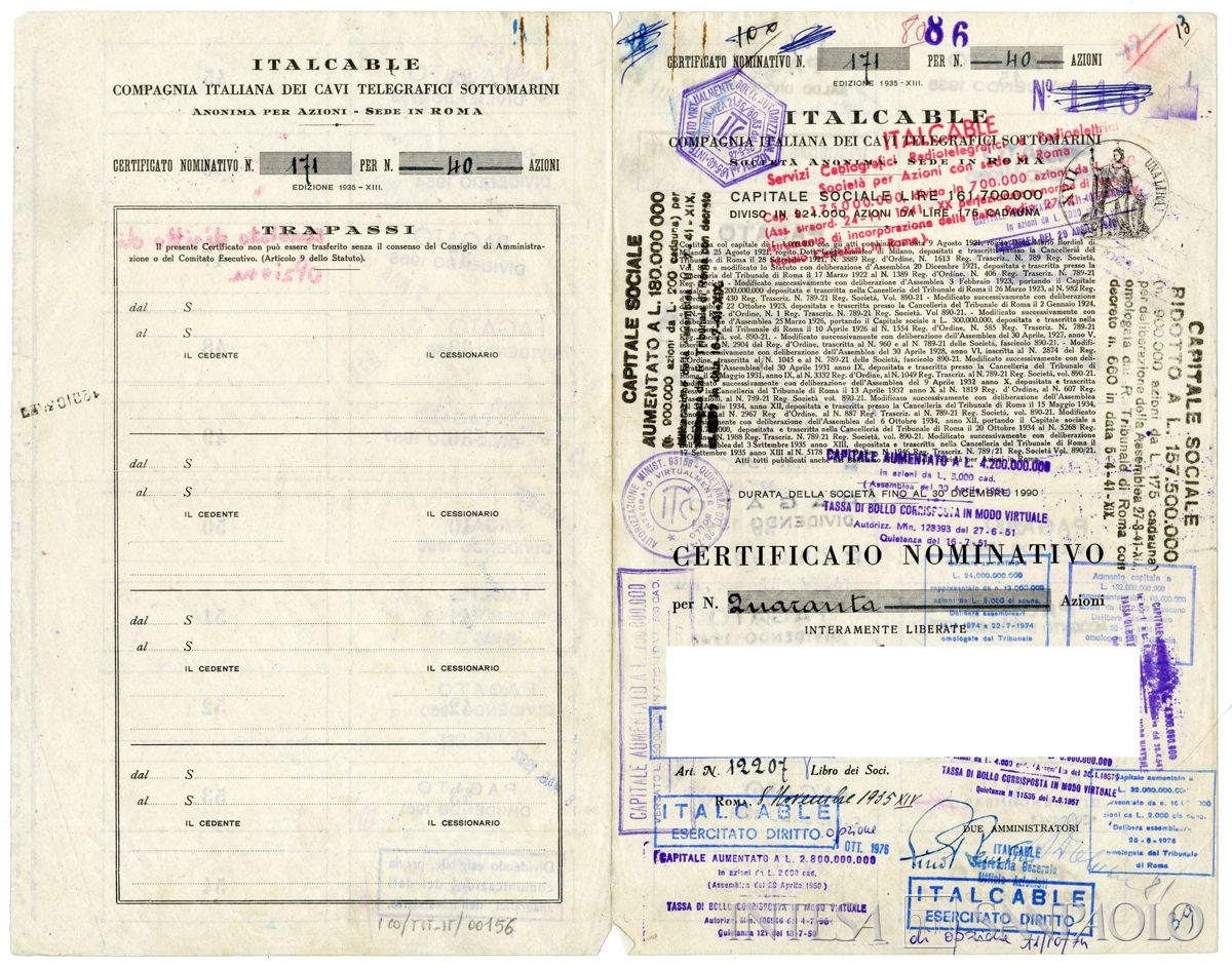 ITALCABLE Compagnia italiana dei cavi telegrafici sottomarini SA, certificato azionario nominativo, 08 novembre 1935