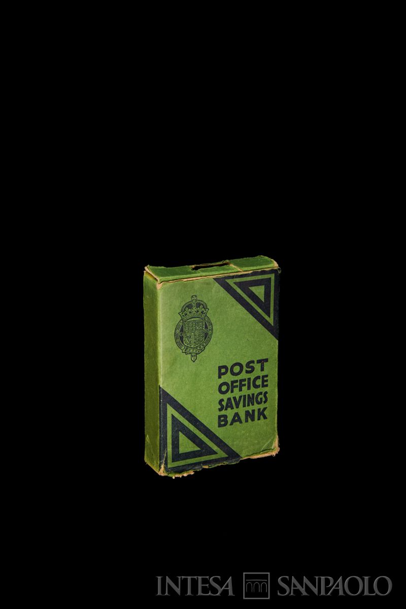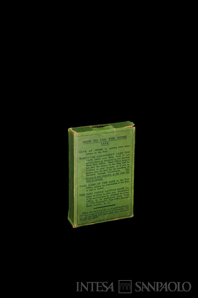 sul verso della scatola: HOW TO USE THE HOME | SAFE | SAVE AT HOME by putting your spare | money in the Safe. | WHENEVER CONVENIENT TAKE THE | SAFE (with your Bank Book if you | already have an account) to any Savings | Bank Post Office. Each Office keeps a | key and the money in the Safe will be | counted in your presence and credited to | your account, or if you so desire, used | for the purchase of National Savings | Certificates. The money is not repayable | at the time the Safe is opened. | TAKE CARE OF THE SAFE as the Post | Office cannot be responsible if the Safe | is lost or stolen. | THE POST OFFICE SAVINGS BANK has | many facilities to offer you. Particulars | of its services may be obtained at a Post | Office, or on application (post free) | to "The Controller, Post Office Savings | Bank, London, W. 14". | When the Safe is given up in good condition, | the sum originally paid for it is repayable. The | use of the Safe will thus have been obtained | FREE OF COST.