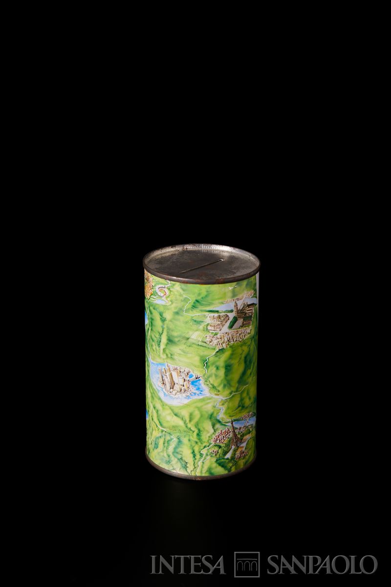 Recipiente a forma di cilindro, o di barattolo. Vi sono raffigurati, visti a volo d'uccello, città e monumenti del mondo: un tempio Buddhista, Monaco di Baviera, San Paolo del Brasile, New York, Londra, Parigi. Originariamente, apertura a strappo sul fondo.
