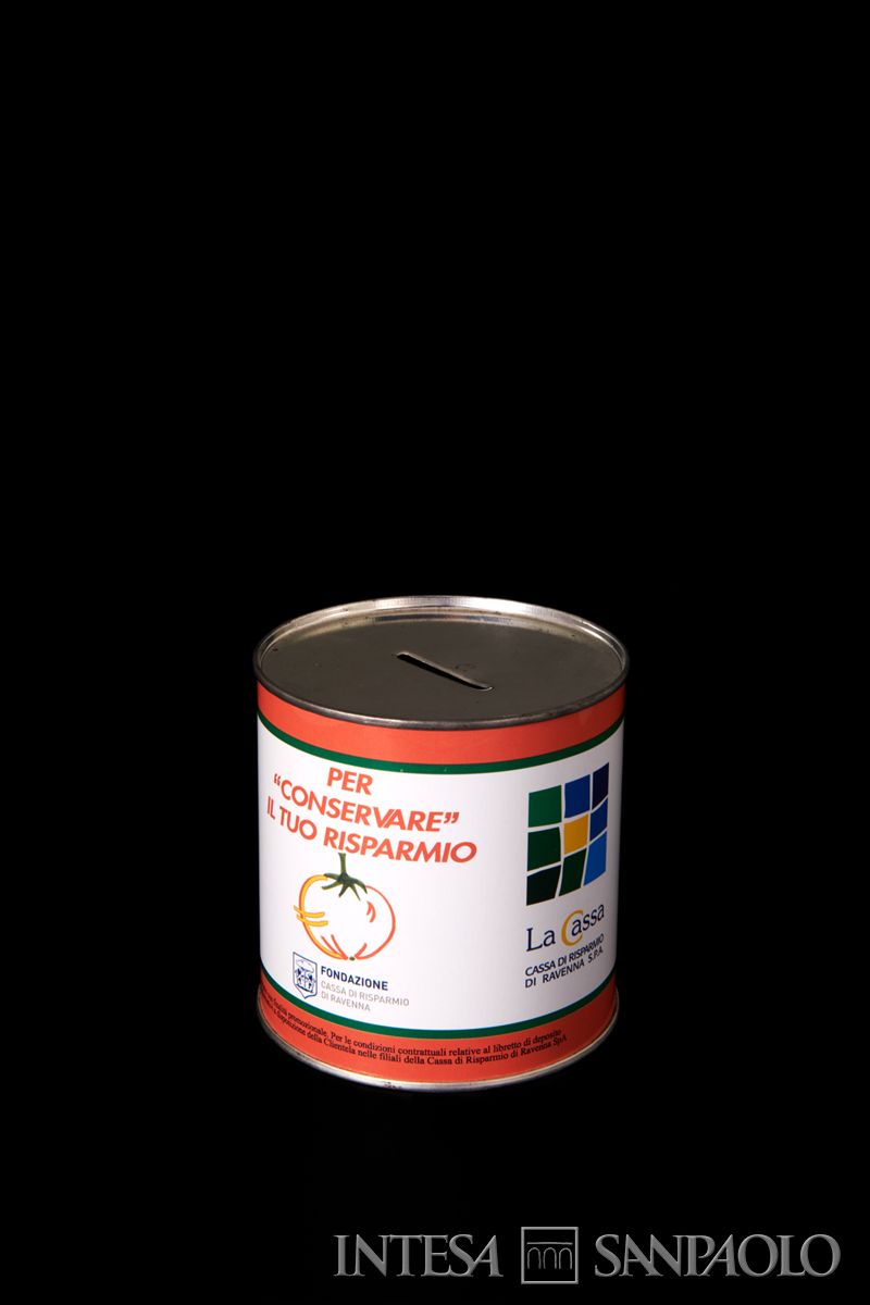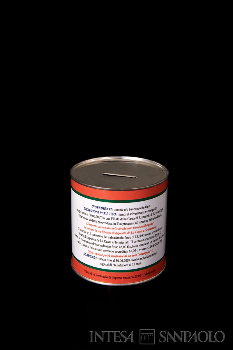 sul corpo cilindrico: PER | "CONSERVARE" | IL TUO RISPARMIO | FONDAZIONE | CASSA DI RISPARMIO | DI RAVENNA | La Cassa | CASSA DI RISPARMIO | DI RAVENNA S.P.A. | INGREDIENTI: monete e/o banconote in uro. | ISTRUZIONI PER L'USO: riempi il salvadanaio e consegnalo | integro entro il 30.06.2007 in una Filiale della Cassa di Risparmio di Ravenna SpA. | Il personale addetto provvederà, in Tua presenza, all'apertura del salvadanaio. | L'importo contenuto nel salvadanaio verrà raddoppiato* | se versato in un libretto di deposito de La Cassa a Te intestato. | (Esempio: se il contenuto del salvadanaio fosse di 18,00 solo se versato in un | libretto di deposito del La Cassa a Te intestato Ti verranno accreditati 36,00 , | mentre se il contenuto del salvadanaio fosse 45,00 solo se versato in un libretto di deposito | de La Cassa a Te intestato verranno accreditati 65,00 ovvero 45,00 +20,00 ). | Ogni ragazzo potrà usufruire di un solo "raddoppio"*. | SCADENZA: valido fino al 30.06.2007 rivolto esclusivamente ai | ragazzi di età inferiore ai 12 anni. | * fino ad un contenuto di importo massimo di 20,00 (Venti euro).
