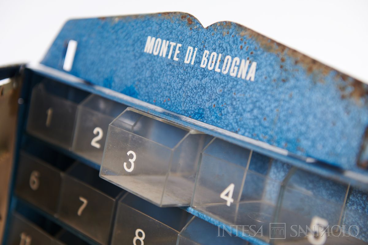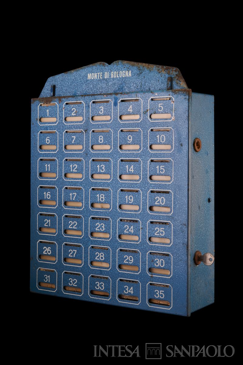 Recipiente a forma di armadietto, o salvadanaio scolastico (salvadanaio collettivo). Il contenitore è dotato di 35 feritoie dietro le quali si celano dei cassettini di plastica trasparente. Ogni cassettino corrispondeva ad un alunno, il quale depositava le monete risparmiate. Serrature sul lato destro. Sul lato posteriore sono presenti due ganci e un foro per appenderlo al muro, mentre su quello superiore una maniglia per il trasporto.