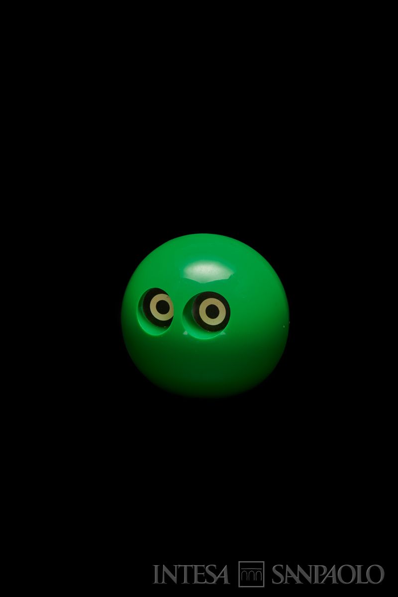 Recipiente a forma di civetta stilizzata. Sul lato posteriore, accanto al nome della banca, compare anche il suo logo: una stella rossa a sette punte attraversata da due linee. Il tappo sul lato inferiore non necessita di chiave e si apre con una rotazione.