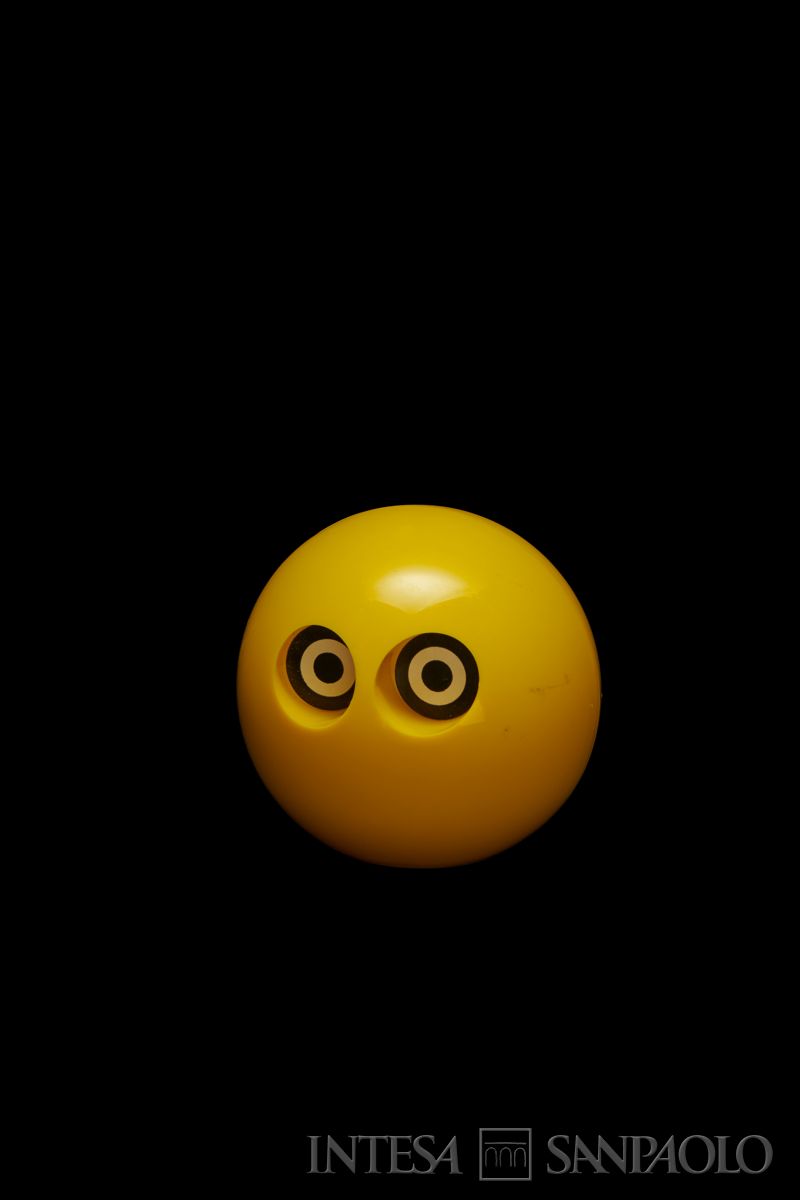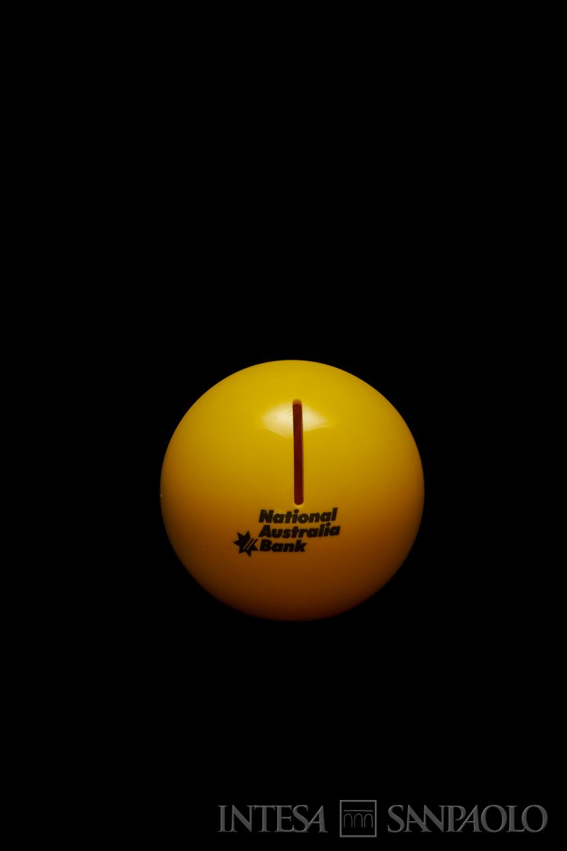 Recipiente a forma di civetta stilizzata. Sul lato posteriore, accanto al nome della banca, compare anche il suo logo: una stella rossa a sette punte attraversata da due linee. Il tappo sul lato inferiore non necessita di chiave e si apre con una rotazione.
