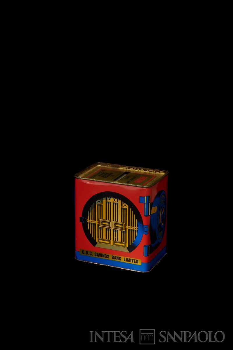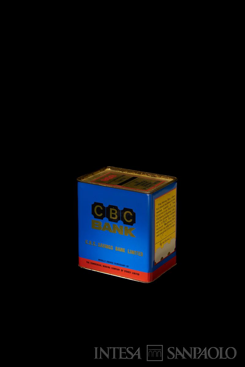 sul lato destro: This Money Box , when | full, should be taken to the | nearest branch of The | Commercial Banking | Company of Sydney Ltd., | and the contents credited | to a C.B.C. Savings | Account. The Money Box | will then returned or a | new one given in exchange. | THIS BOX BELONGS TO | S.T. LEIGH & CO.