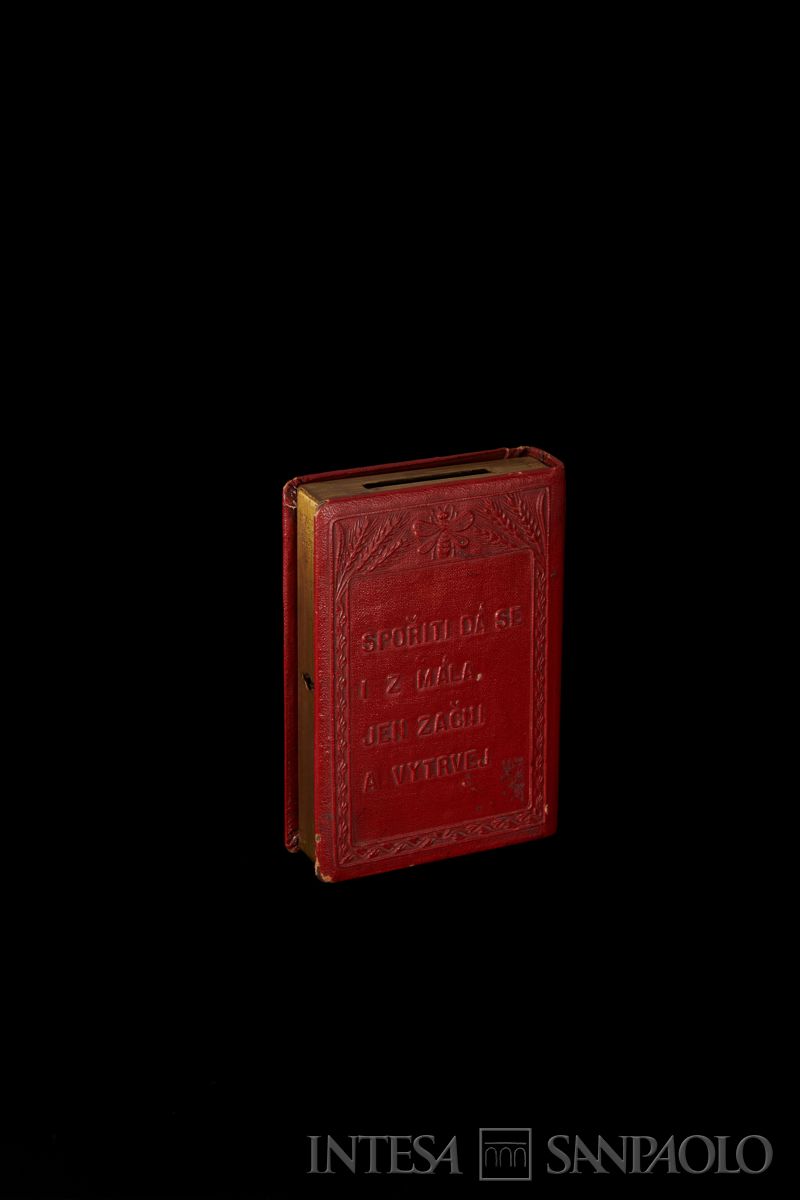 Recipiente a forma di libro. Feritoia sul taglio superiore. Serratura sul taglio. Sul taglio inferiore è presente un foro nel quale inserire le banconote arrotolate.