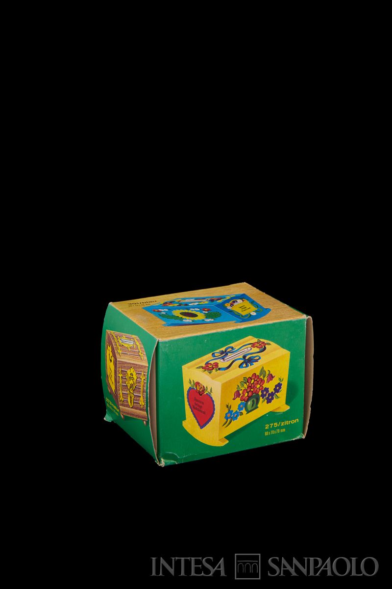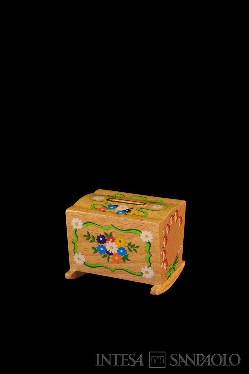 Recipiente a forma di culla. Serratura sul lato inferiore. Decorazione floreale. Sulla scatola originale sono rappresentati i 5 modelli di salvadanaio disponibili: 272/legno naturale, 275/giallo, 276/legno naturale, 300/verde, 301/blu.