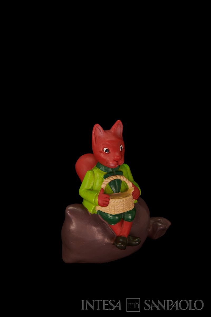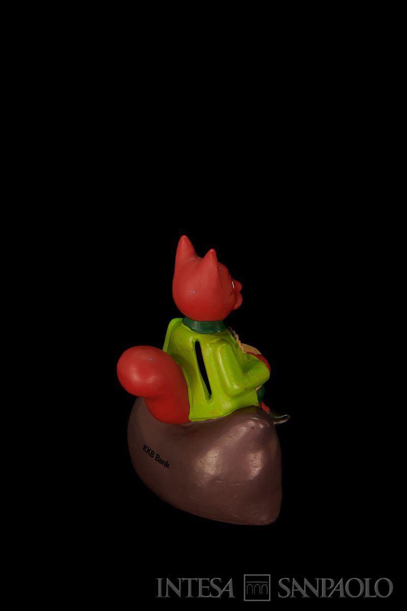 Recipiente a forma di volpe. L'animale, vestito con abiti in stile settecentesco, è seduto su un sacco e regge fra le mani un cestino di vimini. Feritoia sul lato posteriore. Serratura sul lato inferiore.