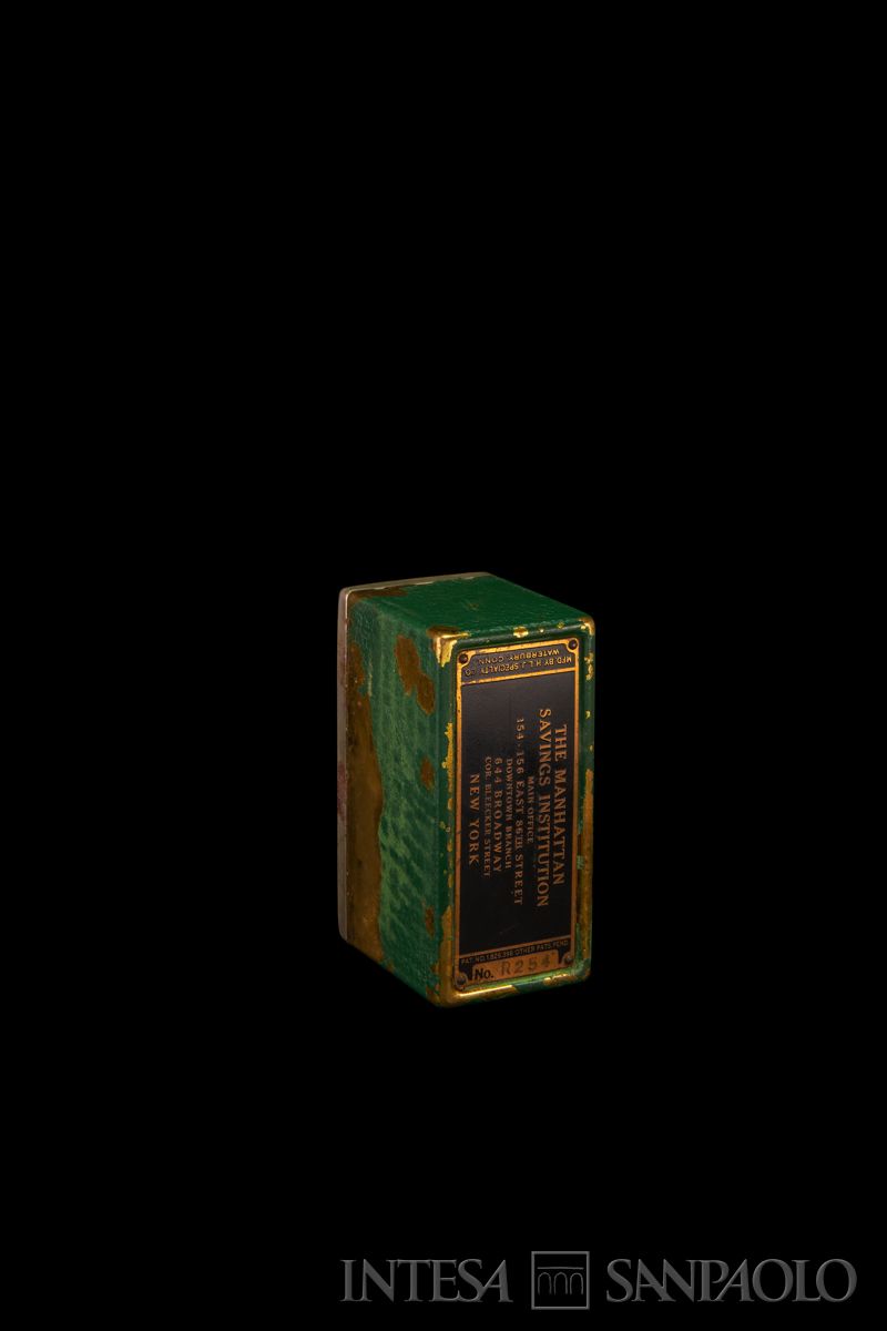 sul lato inferiore: THE MANHATTAN | SAVINGS INSTITUTION | MAIN OFFICE | 154-156 EAST 86TH STREET | DOWNTOWN BRANCH | 644 BROADWAY | COR. BLEECKER STREET | NEW YORK | MFD. BY H. L. J. SPECIALTY CO. | WATERBURY, CONN. | PAT. NO. 1,826,398 OTHER PATS. PEND. | No. R254