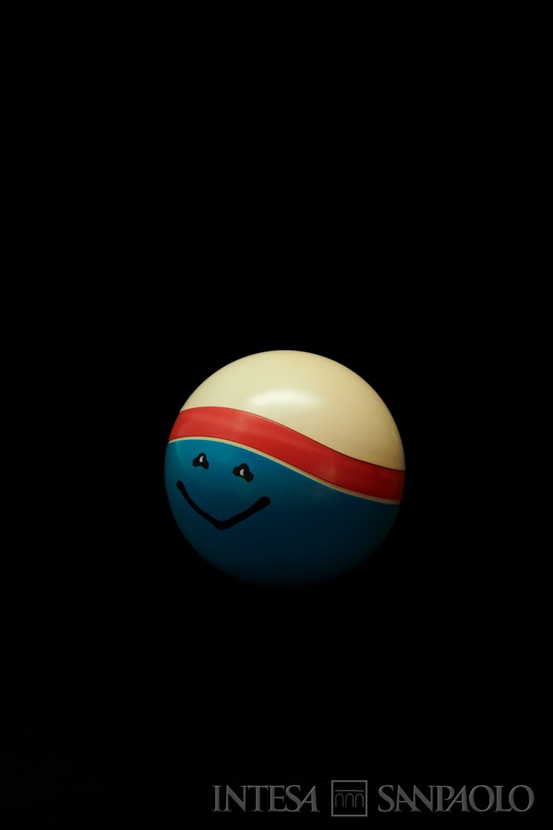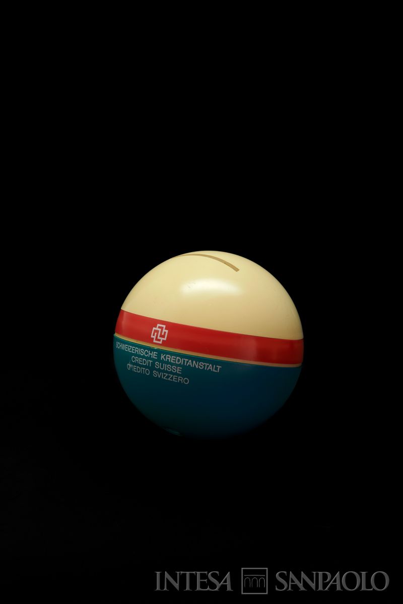 Recipiente a forma di sfera caratterizzata da un volto sorridente. Il salvadanaio è un "misirizzi", ossia un giocattolo la cui base ha forma rotondeggiante e, se sbilanciato, oscilla per poi ritornare in posizione verticale grazie ad un peso. Feritoia sul lato superiore. Serratura sul lato inferiore.