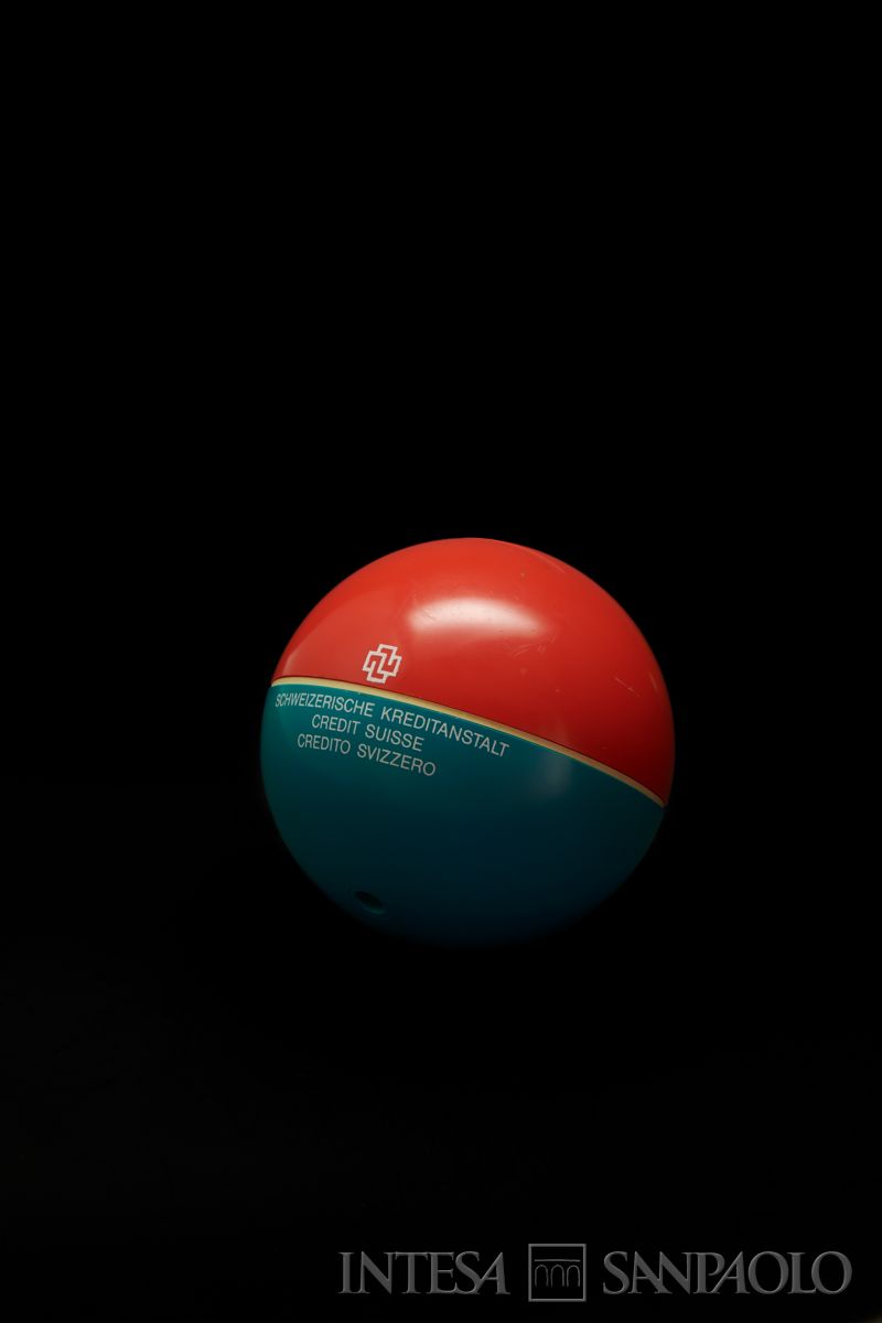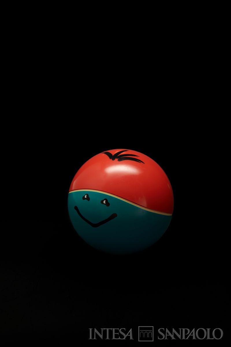 Recipiente a forma di sfera caratterizzata da un volto sorridente. Feritoia sul lato superiore. Serratura sul lato inferiore.