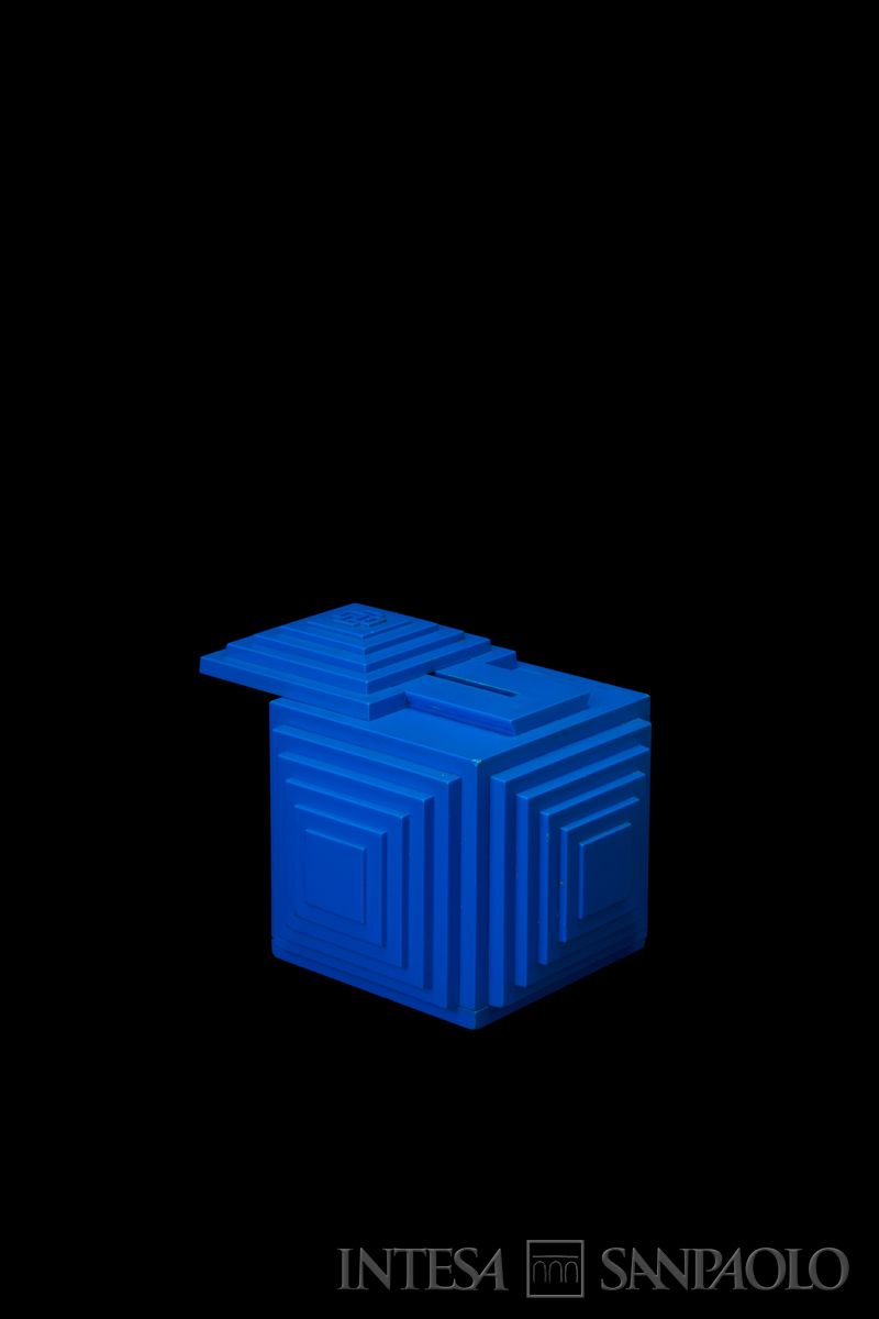 Recipiente a forma di cubo. Da cinque dei sei lati si innalzano dei tronchi di piramide a gradoni di altezza ridotta. Uno di questi nasconde una guida a scorrimento che occulta la feritoia. Il sesto lato presenta le iscrizioni con la denominazione della banca e, attraverso una rotazione, si sgancia dal solido consentendo l'accesso al contenuto del salvadanaio.