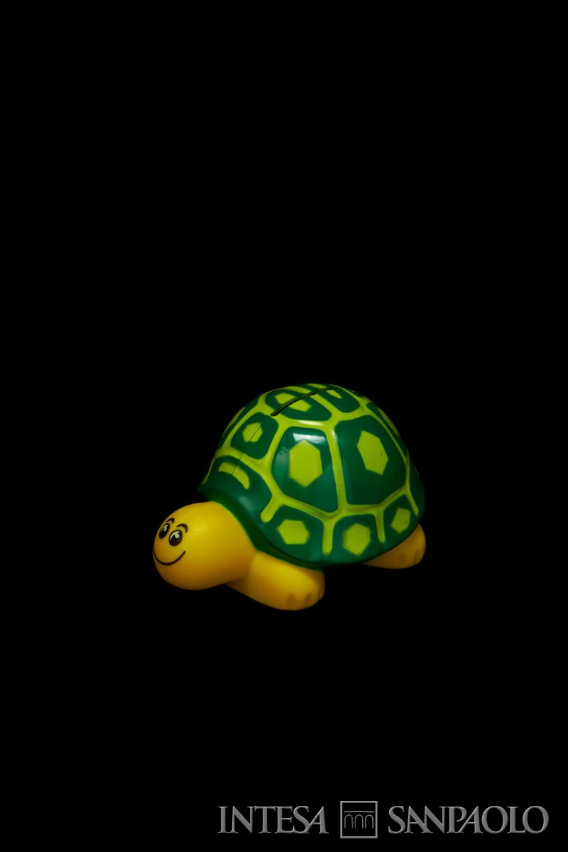 Recipiente a forma di tartaruga. Feritoia sul lato superiore. Serratura sul lato inferiore.