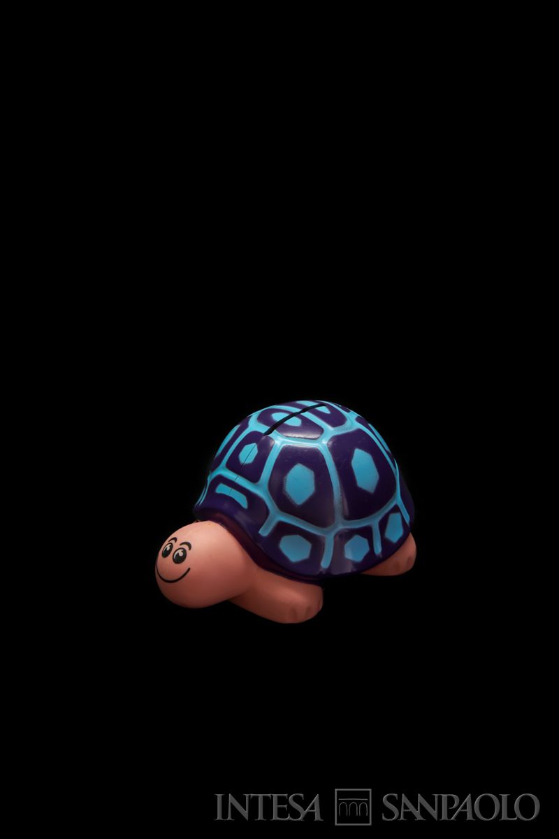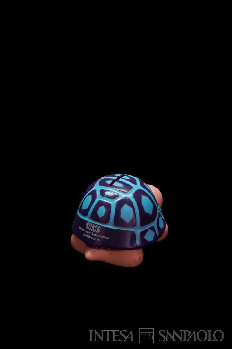 Recipiente a forma di tartaruga. Feritoia sul lato superiore. Serratura sul lato inferiore.