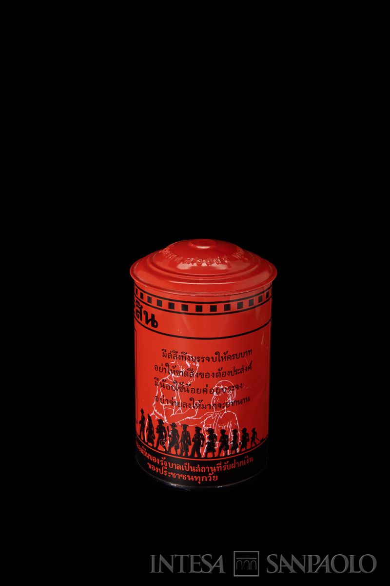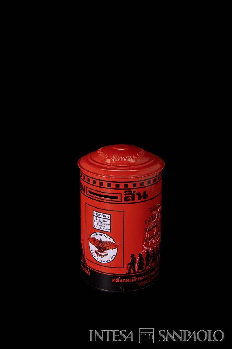 Recipiente a forma di cassetta postale. Feritoia sul lato anteriore. Il salvadanaio è illustrato con scene e personaggi di vario genere: sul fronte vi è la divinità Indù Garuda accompagnata da un corno, tradizionale simbolo delle poste; lungo la circonferenza del salvadanaio vi sono silhouette di uomini, donne e bambini e ciascuno reca con sé un simbolo di gioco, lavoro, studio e vita quotidiana; oltre alle silhouette, vi è il profilo di donna che consegna una moneta ad un ragazzino e lo skyline di una città, forse Bangkok.
