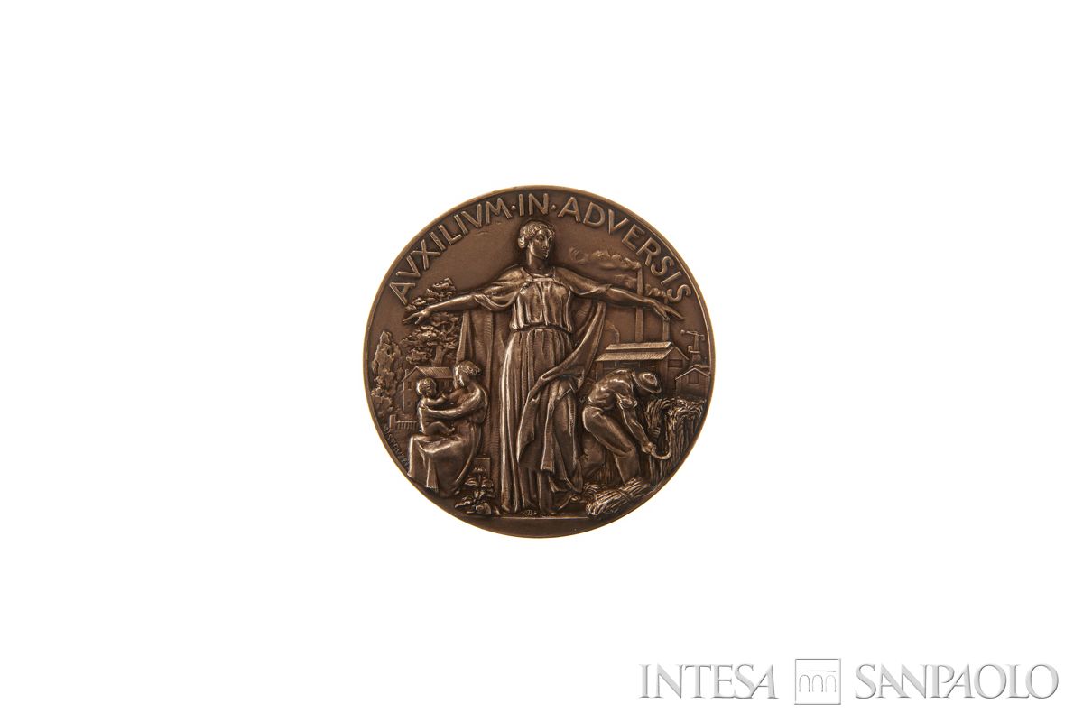 Figura femminile allegorica, con braccia aperte, in atto di protezione; sotto il suo braccio destro una madre con figlio seduto in braccio; sotto braccio sinistro un contadino trebbiatore. Sul fondo immagini di industria e di campagna