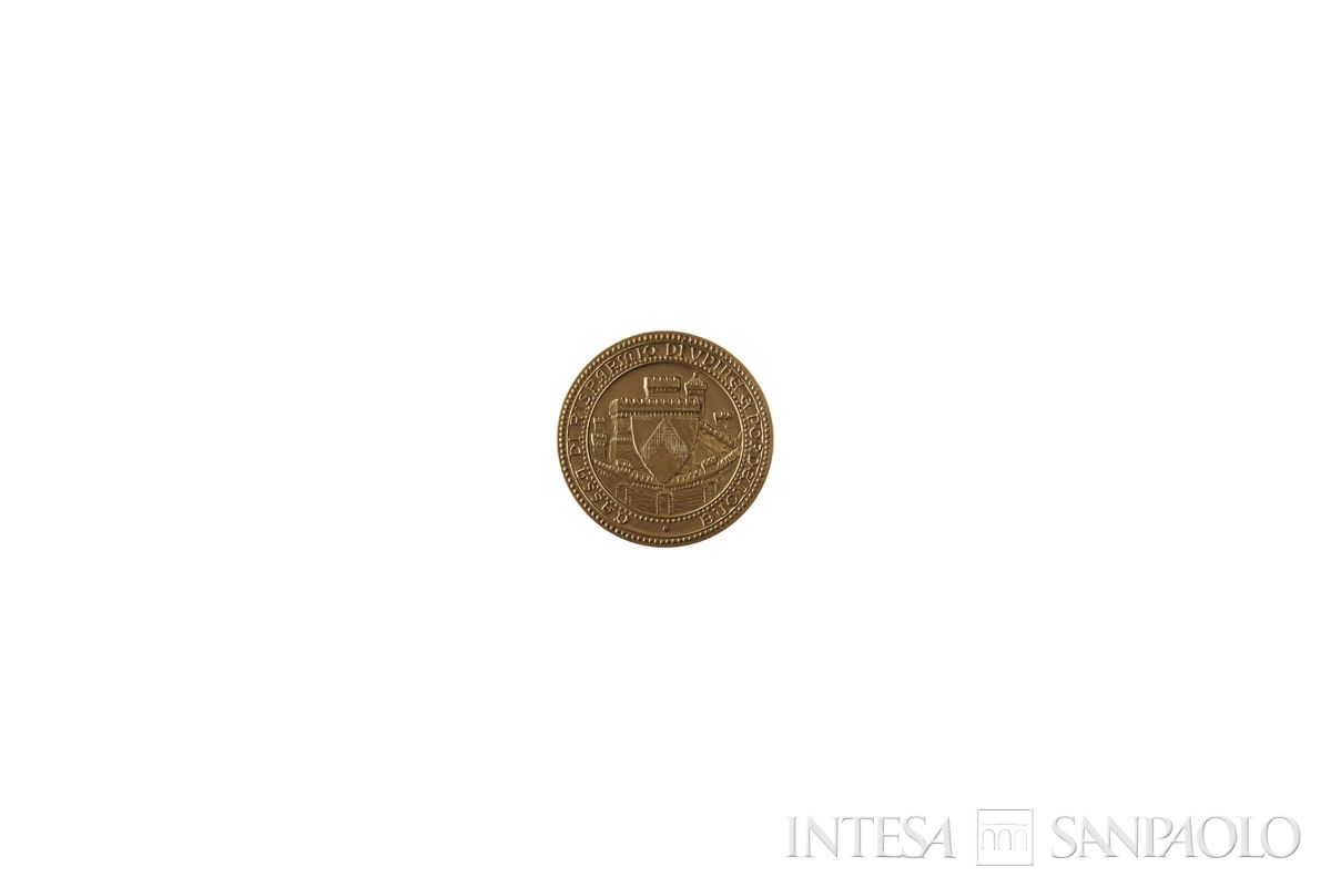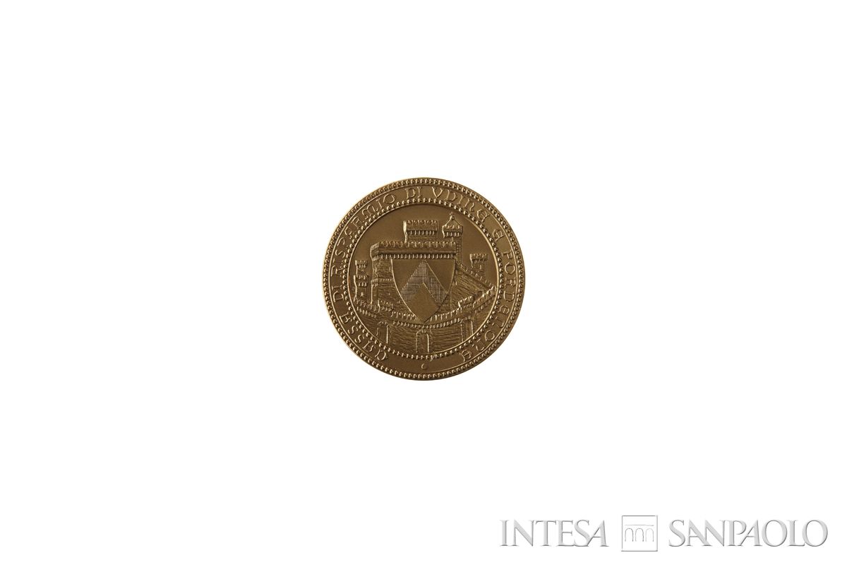 Entro cornice circolare perlinata lo stemma di Udine sulla vista del Castello della città.