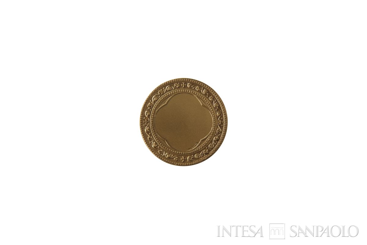 Cornice a foglie intercalata da quattro croci e contenuta da cerchio perlinato e da cornice lineare quadrilobata; al centro il campo vuoto da personalizzare.
