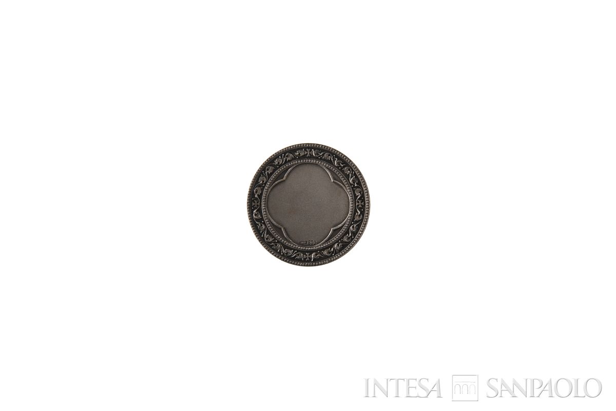 Cornice a foglie intercalata da quattro croci e contenuta da cerchio perlinato e da cornice lineare quadrilobata; al centro il campo vuoto da personalizzare