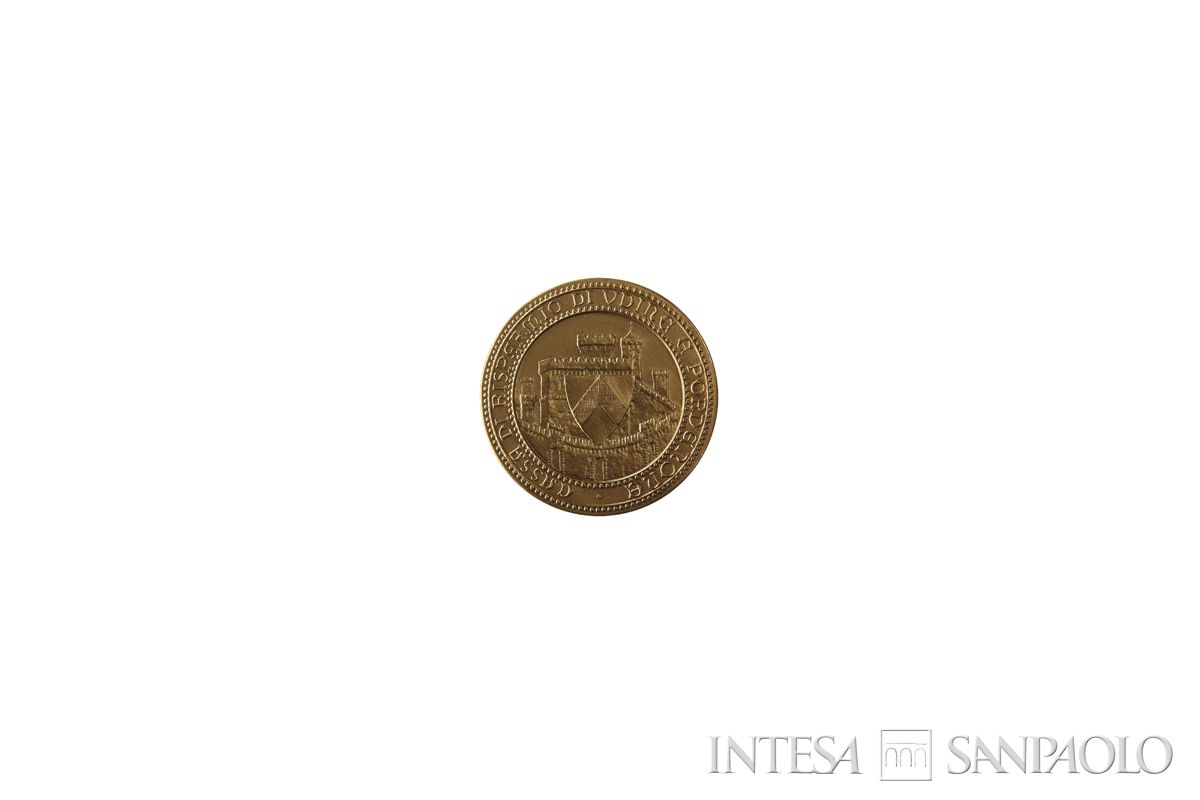 Entro cornice circolare perlinata lo stemma di Udine sulla vista del Castello della città