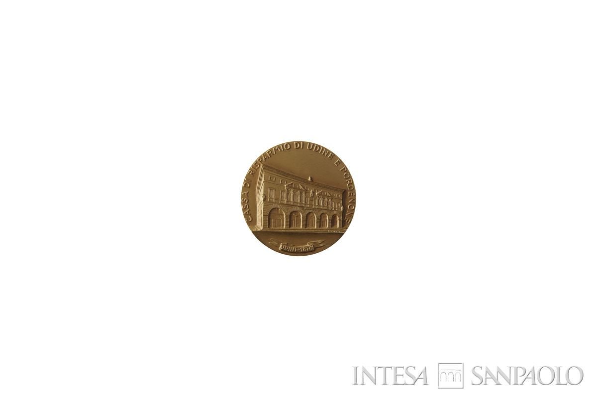 Medaglia, probabilmente commemorativa, raffigurante la facciata del palazzo del Monte di Pietà, in via del Monte, 1 a Udine; già sede della Cassa di Risparmio di Udine a partire dal 1942, fu sede della Cassa di Risparmio di Udine e Pordenone dal 1968, anno della fusione dei due istituti (da https://mappastorica.intesasanpaolo.com/bank/detail/IT-ISP-MAPPAITALIA-0000257/monte-pieta-udine)