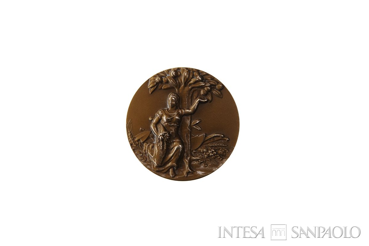 Figura allegorica femminile seduta ai piedi di un melograno, la mano sinistra protesa a raccoglierne un frutto e nella mano destra una cornucopia; intorno ai piedi dell'albero strumenti di lavoro, spighe, frutti e monete