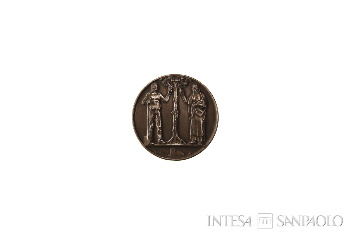 Figura maschile e figura femminile ai lati di un albero con le date che sorgono dalle radici (1842) fino alla cima (1942); in esergo la veduta della città di Trieste