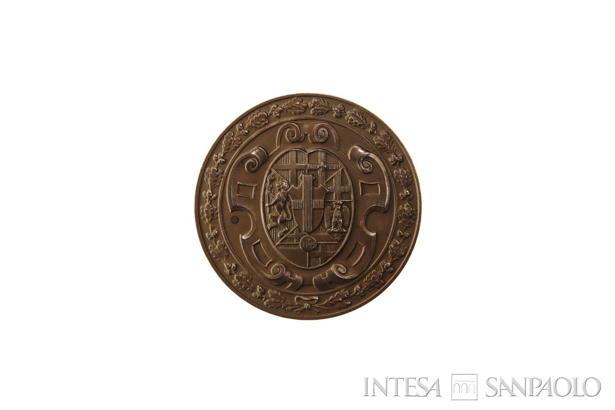 Rami di quercia entro contorno circolare continuo e all'interno lo stemma di Alessandria
