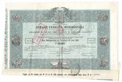 Strade Ferrate Meridionali Società italiana, certificato obbligazionario al portatore