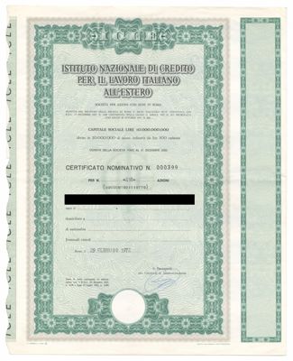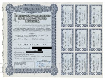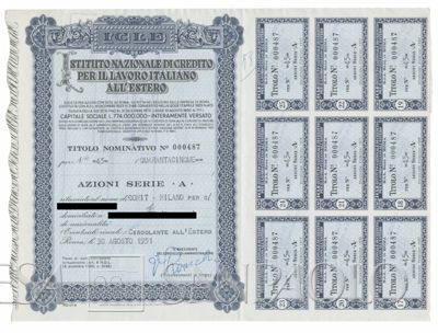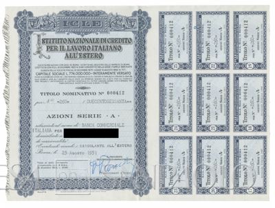 Istituto Nazionale di credito per il lavoro italiano all'estero ICLE, certificati azionari nominativi